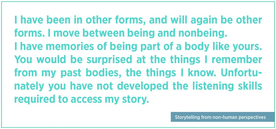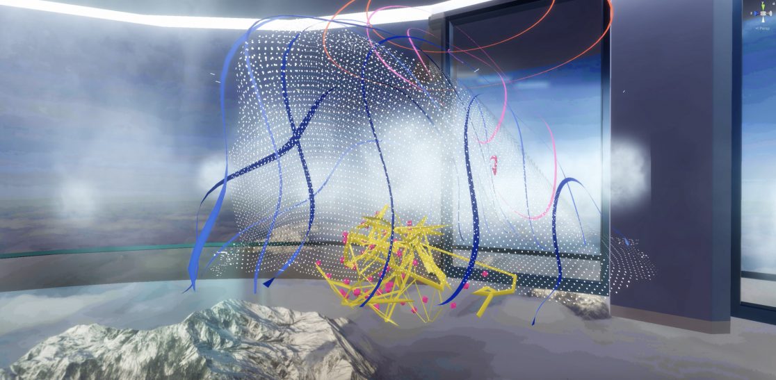 Leaking Bodies is a virtual reality (VR) project that explores the hidden energies and activities of materials connecting the atmosphere and living beings. Through storytelling, soundscape and VR worlding we explore the interconnections of Tree, Stone, Cloud and Human. Each of these are represented as living, leaky bodies in a virtual world which makes visible their exchange of particles with one another; incorporating the visitor into these cooperative systems. Decay, evaporation, photosynthesis, cloud formation, electromagnetic fields, cosmic energy; so many processes of energy and material circulation connect us with all living beings in a relationship of exchange. In the virtual space of ‘Leaking Bodies’ visitors can interact with these bodies to reveal hidden narratives that develop a personal connection to the beings in the space. These stories are written from human and non-human perspectives through which we evoke memory and experience, questioning whether these are only human abilities or are in fact possessed by all matter.