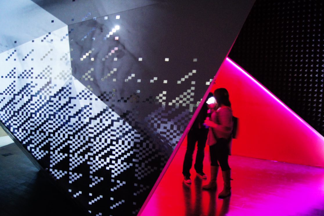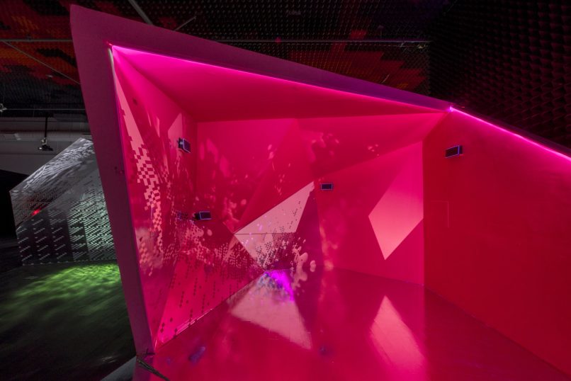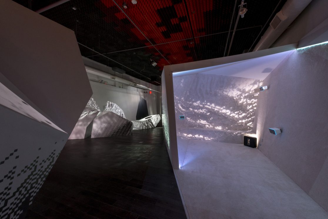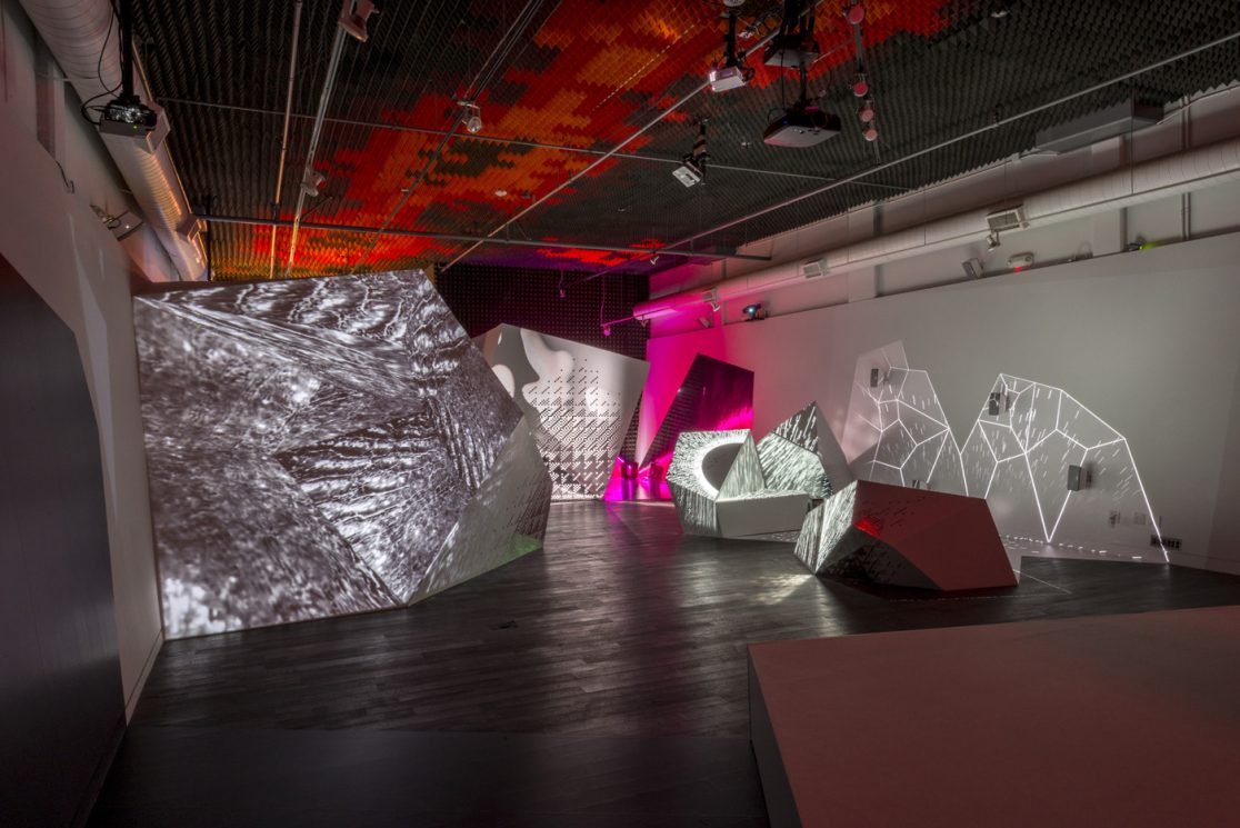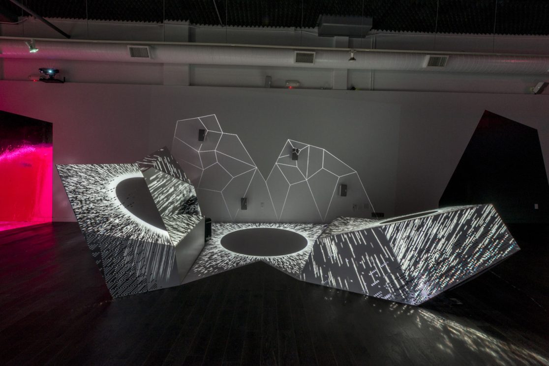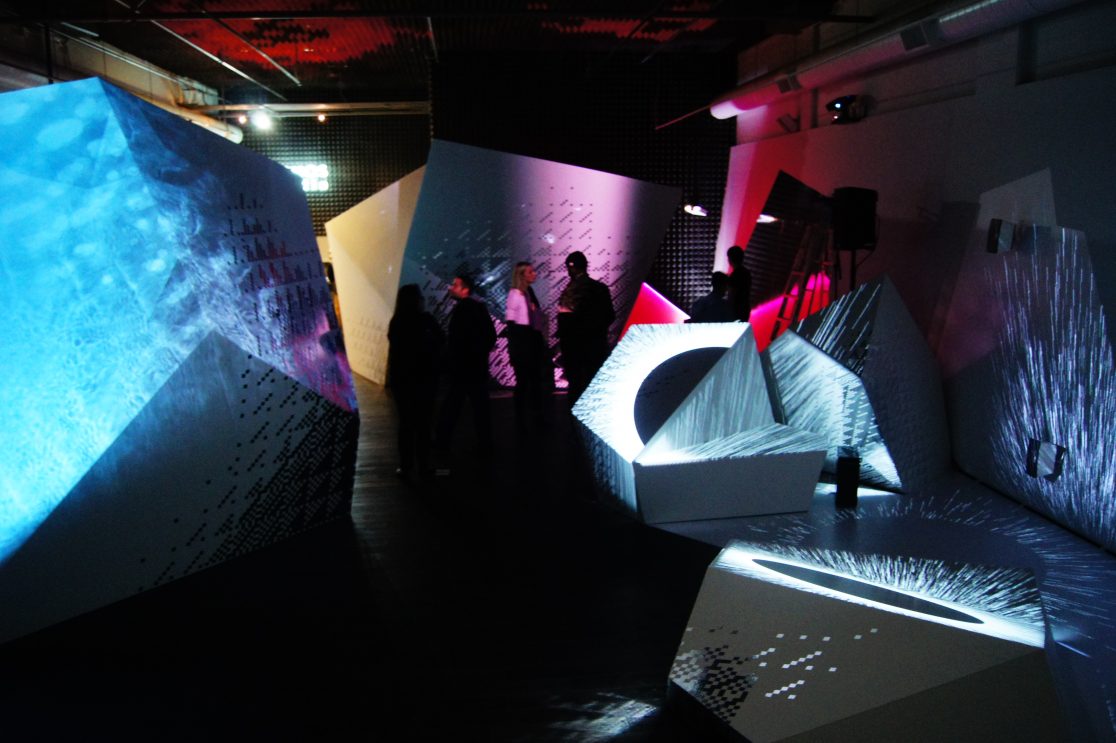For this exhibition I created mapped video across the interior and exterior surfaces of large geodesic structures throughout the space. Working in collaboration with architects P-A-T-T-E-R-N-S and sounds designer Jon Berson, three distinctly different spaces evolved to transform audiences mood as they traverse the gallery. Custom mapped visuals, spanning 7 projectors, illuminated textured walls, revealing the geodesic surfaces, echoeing and amplifying the sound and creating a transformational audience experience.
