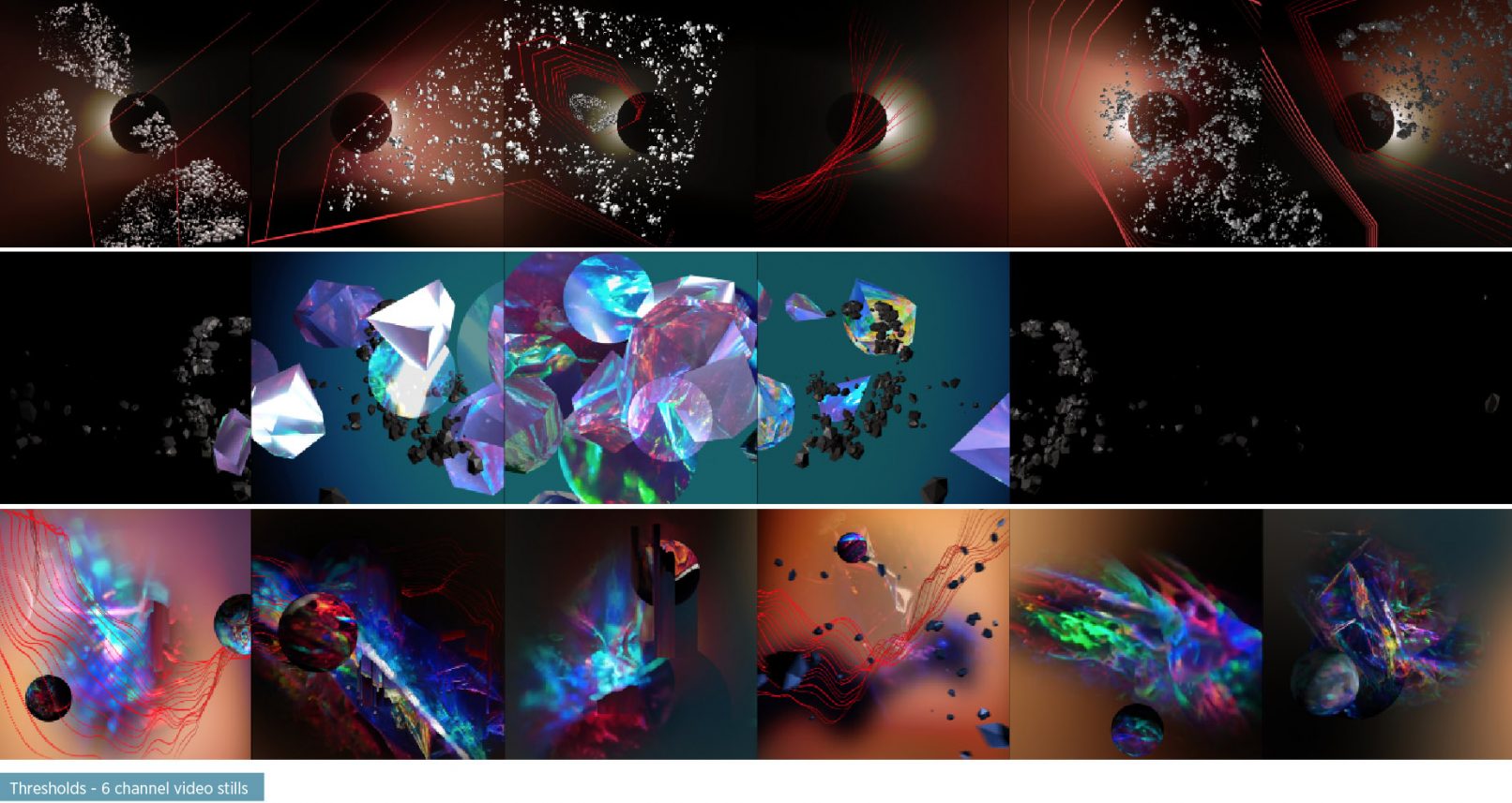 Thresholds is a multichannel sound and video installation piece commissioned in 2018 by the Institute for Sound and Music Berlin for the ISM Hexadome alongside artists such as Brian Eno, Ben Frost + MFO, Holly Herndon and Thom York +Tarik Barri.
